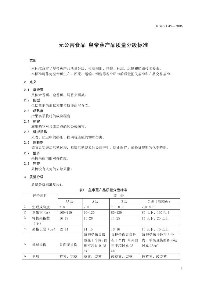 DB46/T 45-2006 无公害食品 皇帝蕉产品质量分极标准