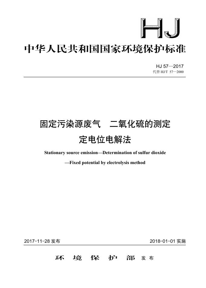HJ 57-2017 固定污染源废气 二氧化硫的测定 定电位电解法