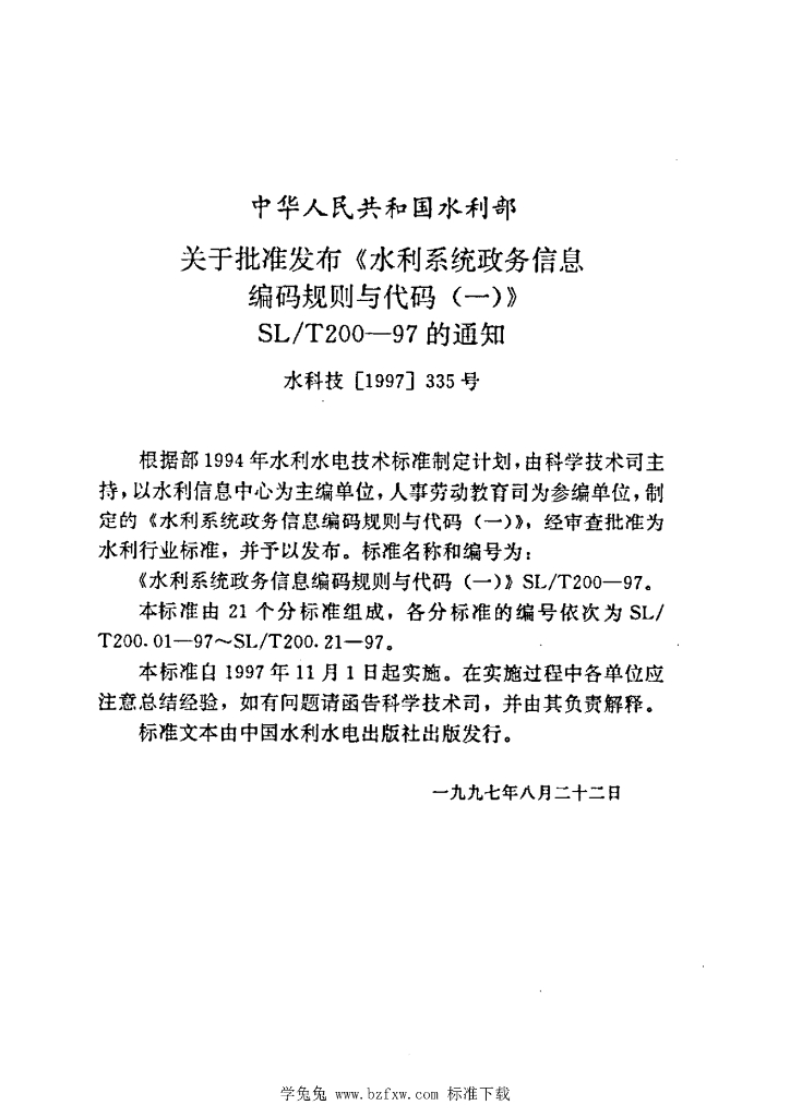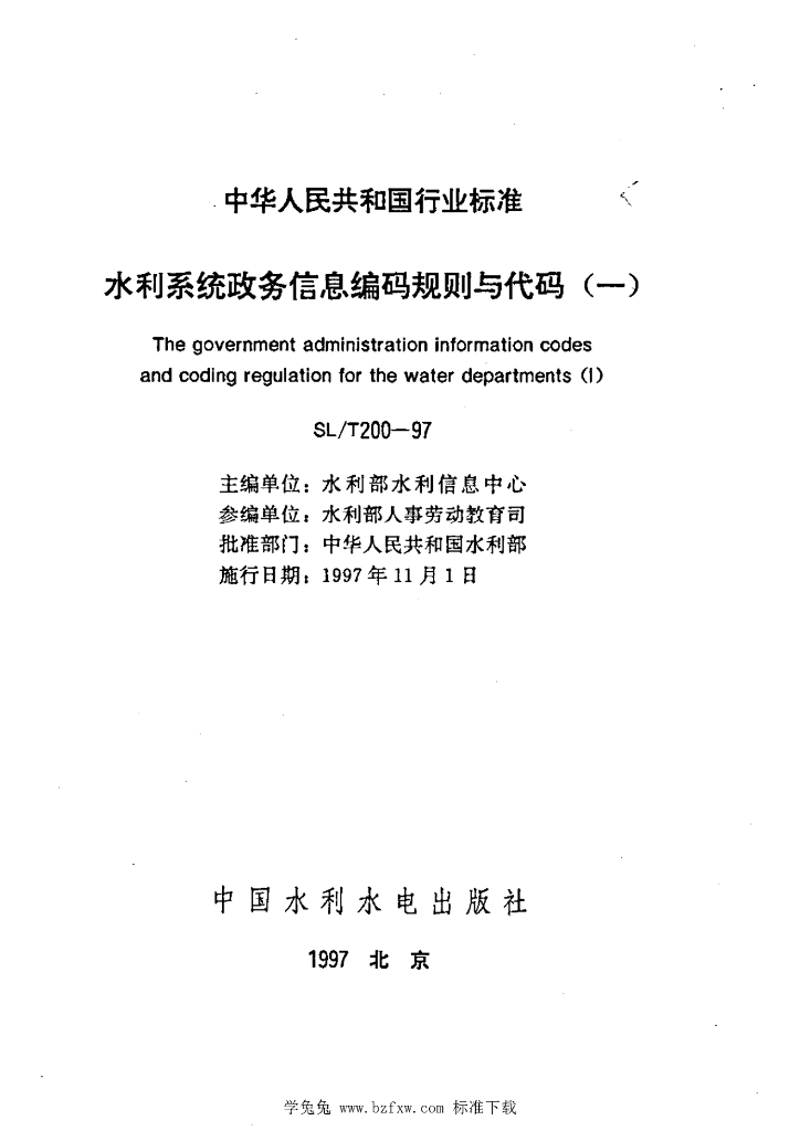 SL/T 200-1997 水利系统政务信息编码规则与代码(一)1~21部分