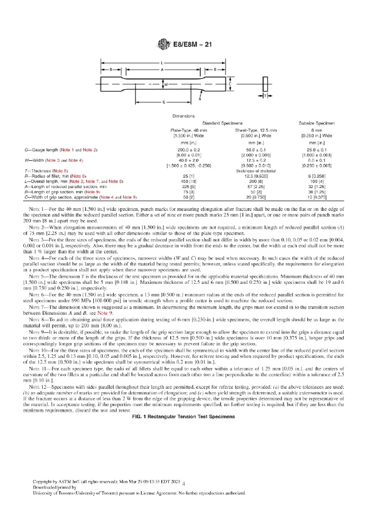 ASTM E8/E8M-21 Standard Test Methods for Tension Testing of Metallic Materials