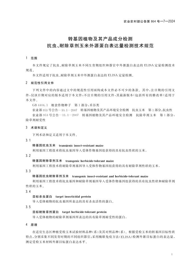 农业农村部公告 第864号-7-2024 转基因植物及其产品成分检测 抗虫、耐除草剂玉米外源蛋白表达量检测技术规范