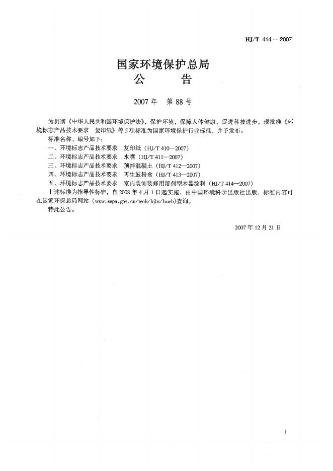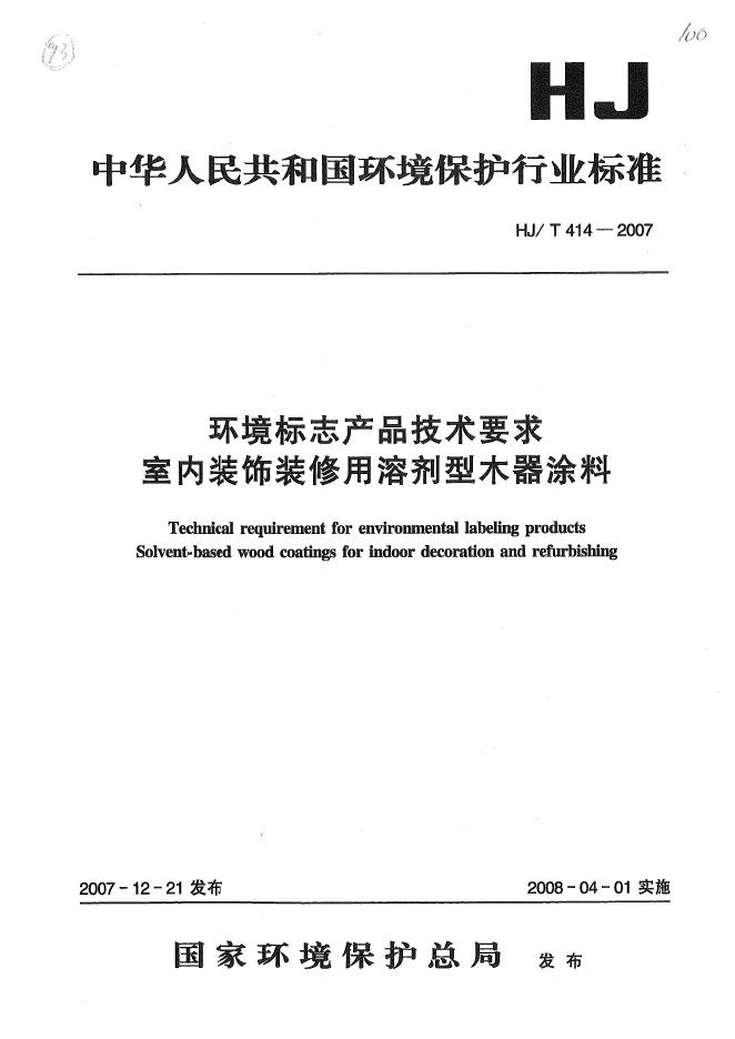 HJ/T 414-2007 环境标志产品技术要求 室内装饰装修用溶剂型木器涂料