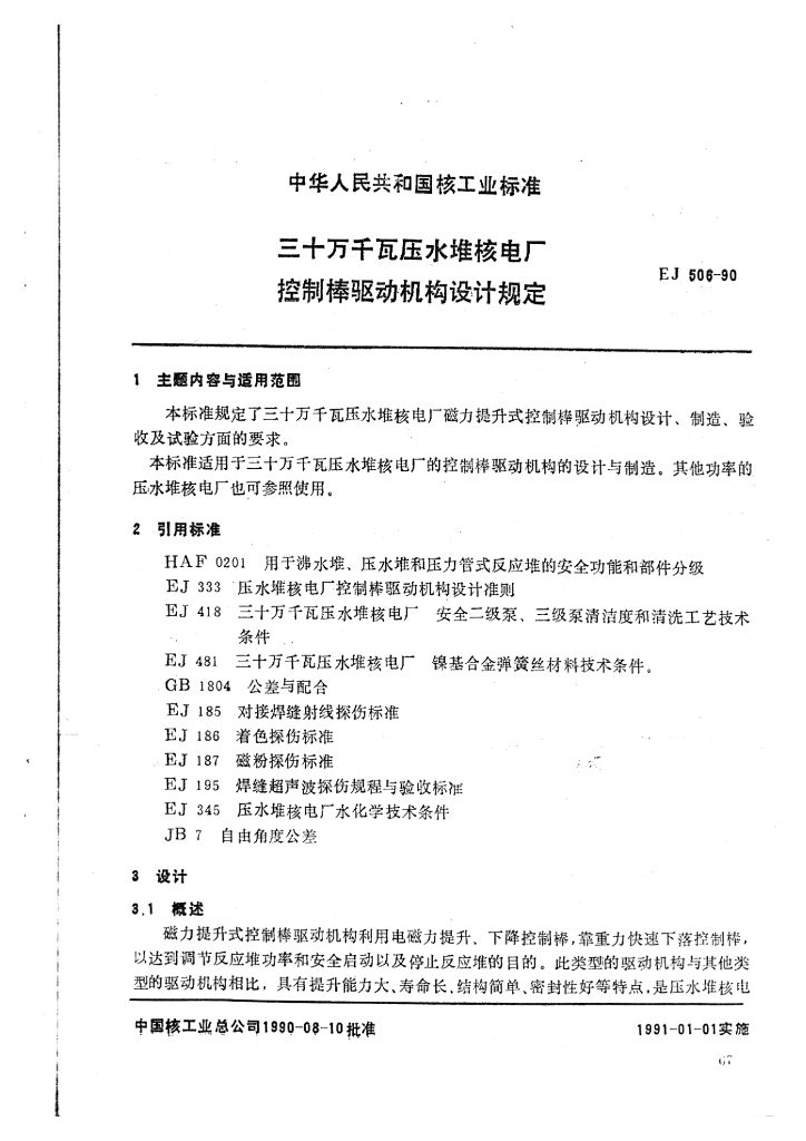 EJ/T 506-1990 三十万千瓦压水堆核电厂 控制棒驱动机构设计规定