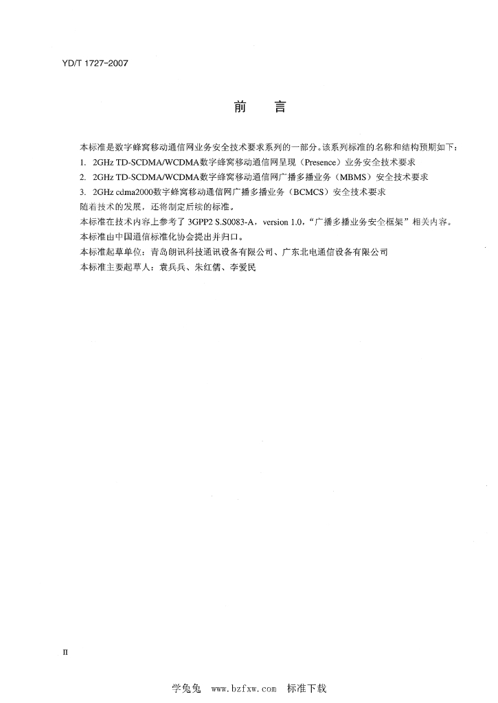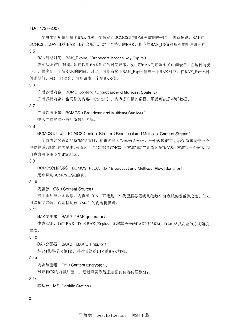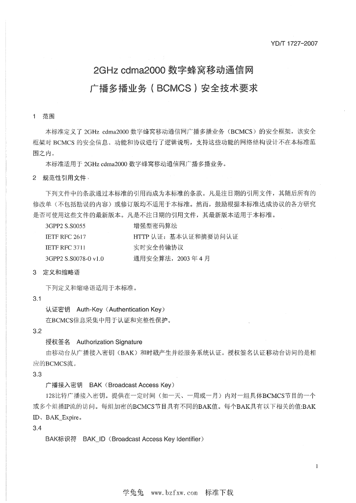 YD/T 1727-2007 2GHz cdma2000数字蜂窝移动通信网广播多播业务(BCMCS)安全技术要求