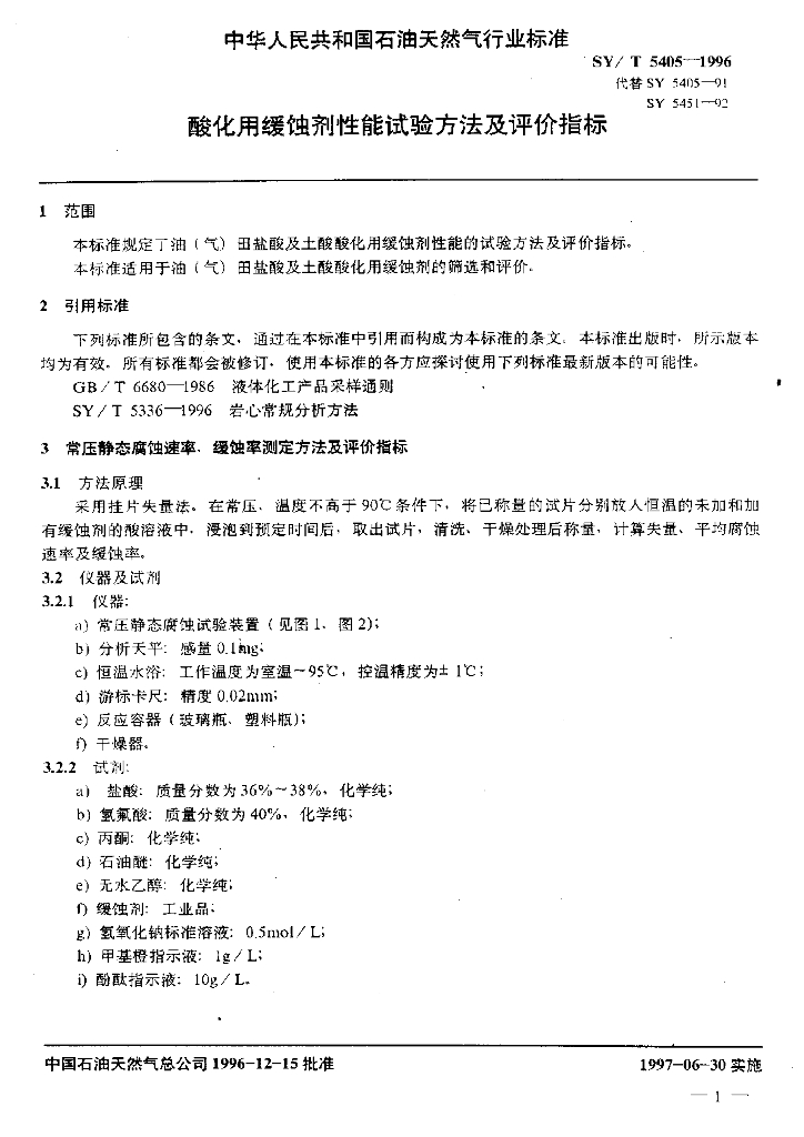 SY/T 5405-1996 酸化用缓蚀剂性能试验方法及评价指标
