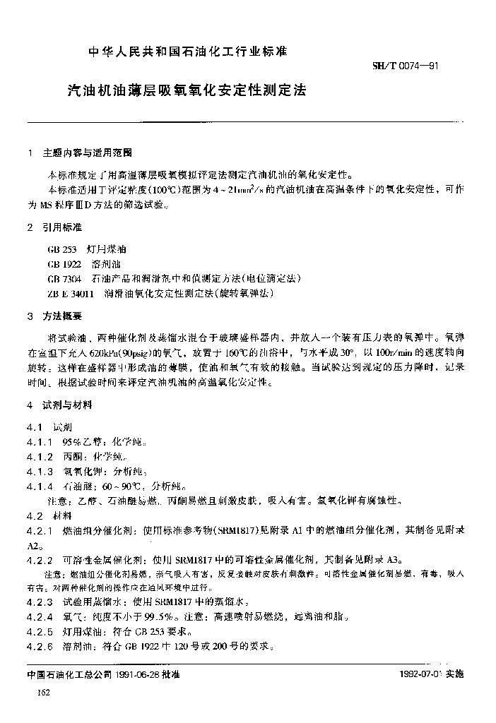 SH/T 0074-1991 汽油机油薄层吸氧氧化安定性测定法
