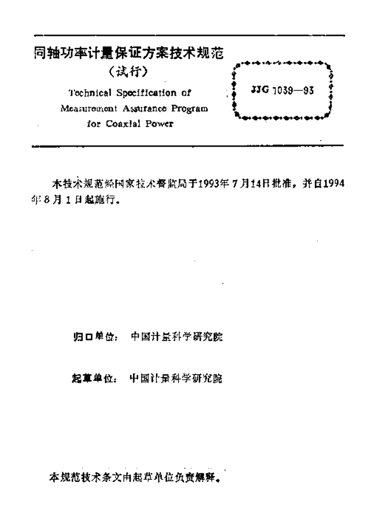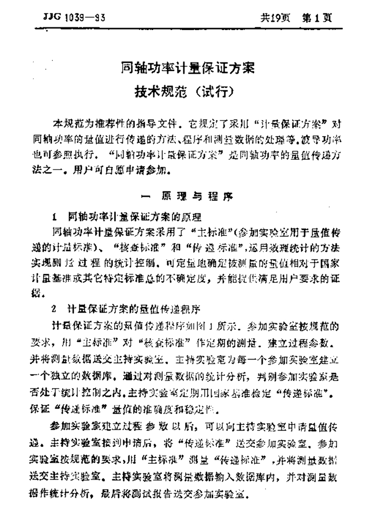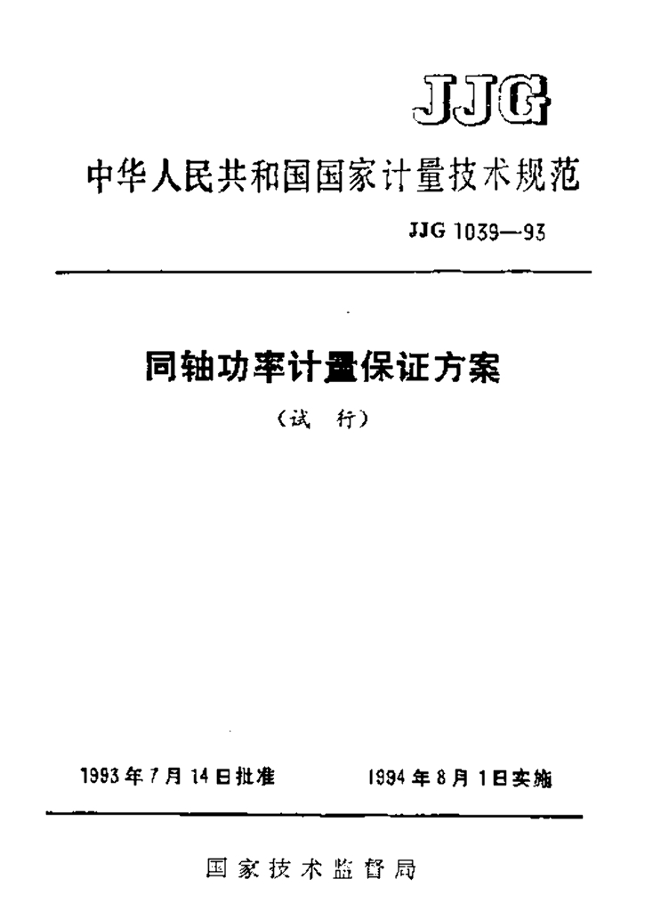 JJF 1039-1993 同轴功率计量保证方案技术规范