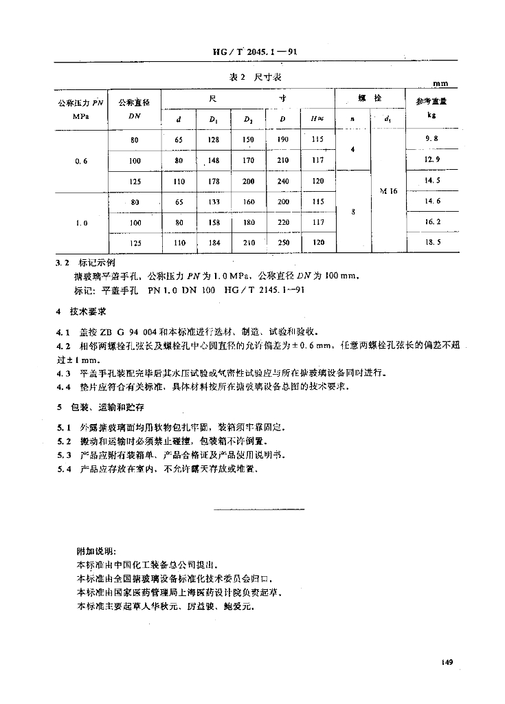 HG/T 2145.1-1991 搪玻璃手孔 平盖手孔