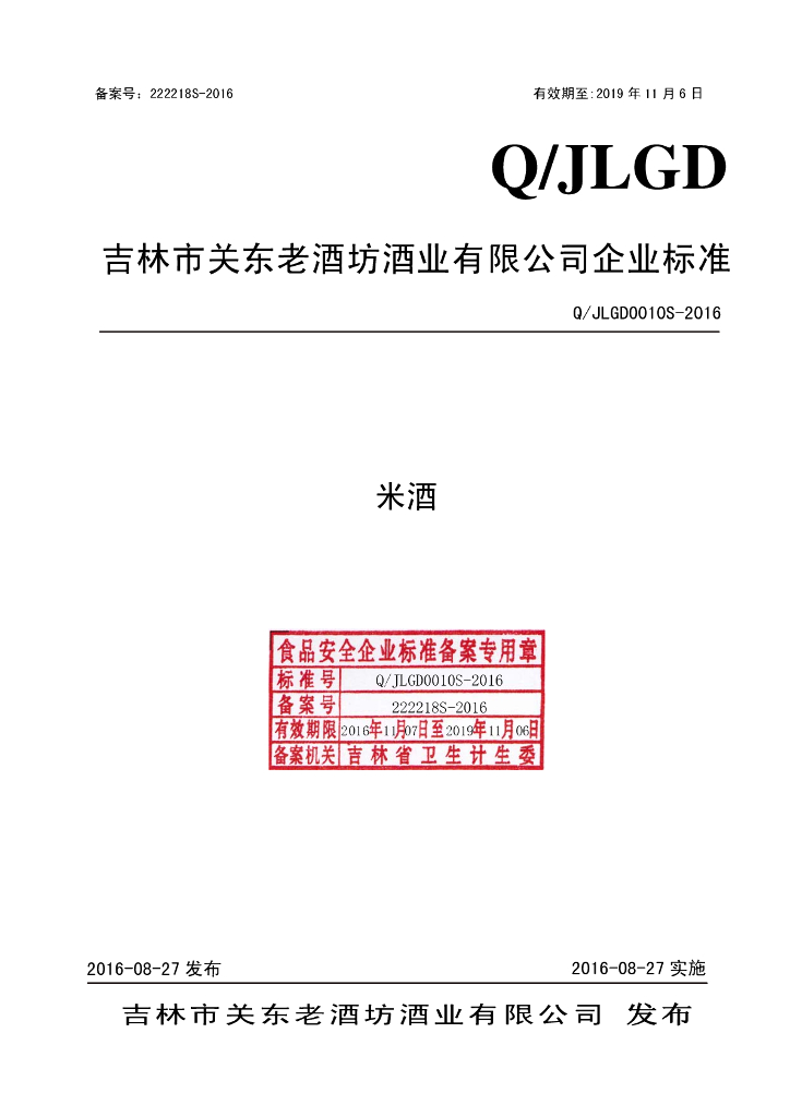 Q/JLGD 0010S-2016 吉林市关东老酒坊酒业有限公司 米酒
