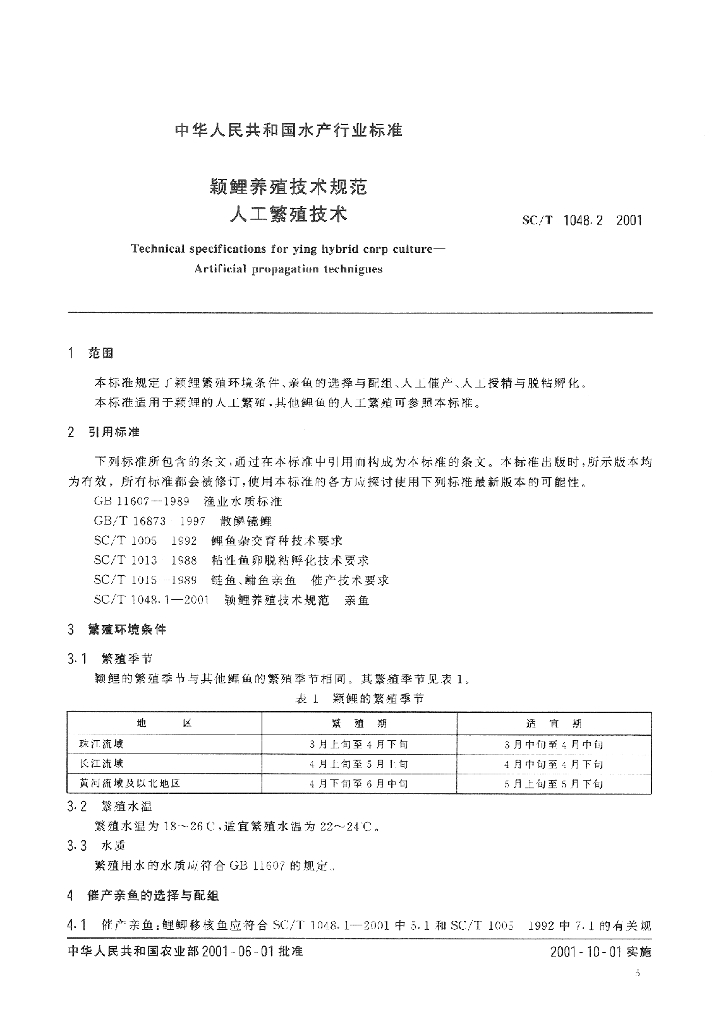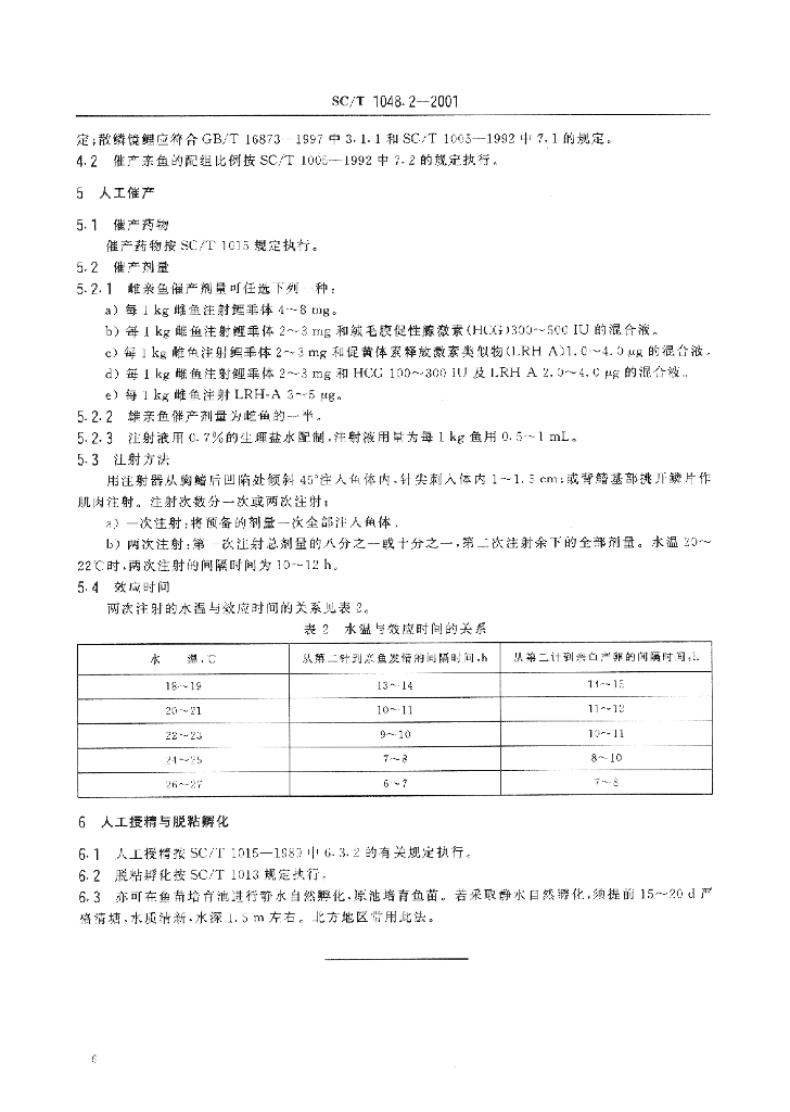 SC/T 1048.2-2001 颖鲤养殖技术规范 人工繁殖技术