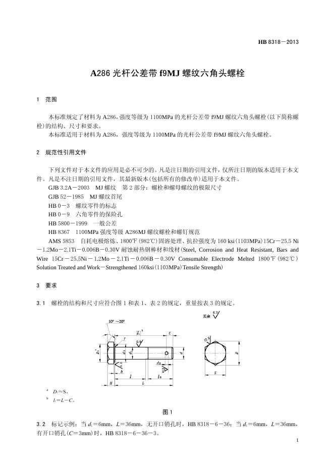HB 8318-2013(2017) A286光杆公差带F9MJ螺纹六角头螺栓