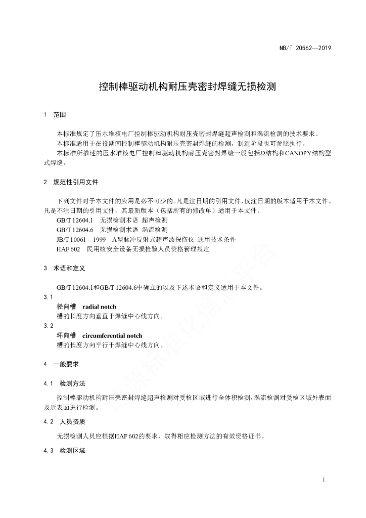 NB/T 20562-2019 控制棒驱动机构耐压壳密封焊缝无损检测