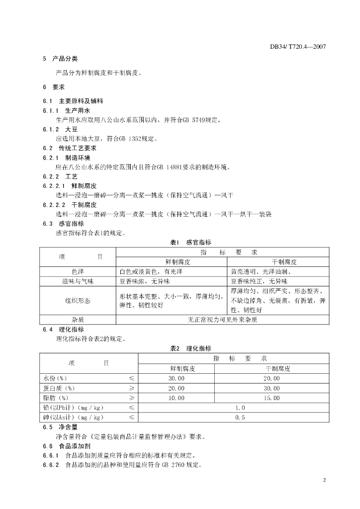 DB34/T 720.4-2007 地理标志产品 八公山豆腐 腐皮