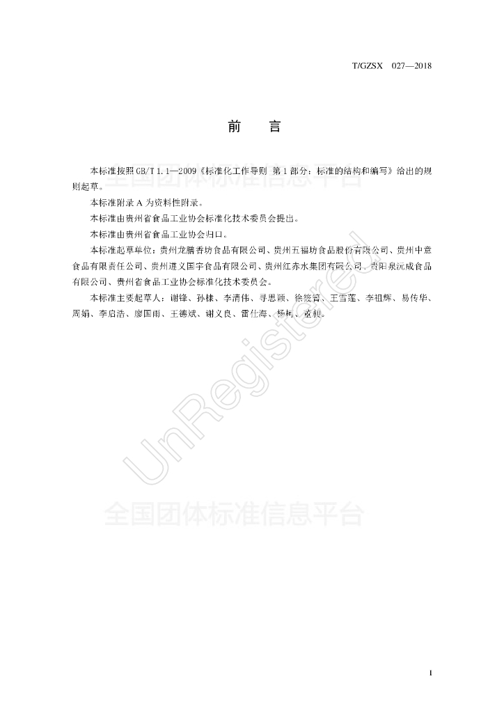 贵州龙膳香坊食品有限公司、贵州五福坊食品股份有限公司、贵州中意食品有限责任公司、贵州遵义国宇食品有限公司、贵州红赤水集团有限公司、贵阳泉沅成食品有限公司、贵州省食品工业协会标准化技术委员会