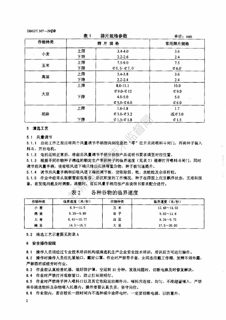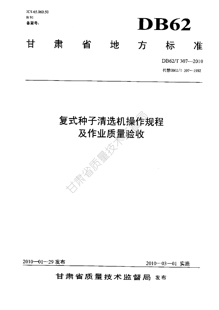 DB62/T 307-2010 复式种子清选机操作规程及作业质量验收