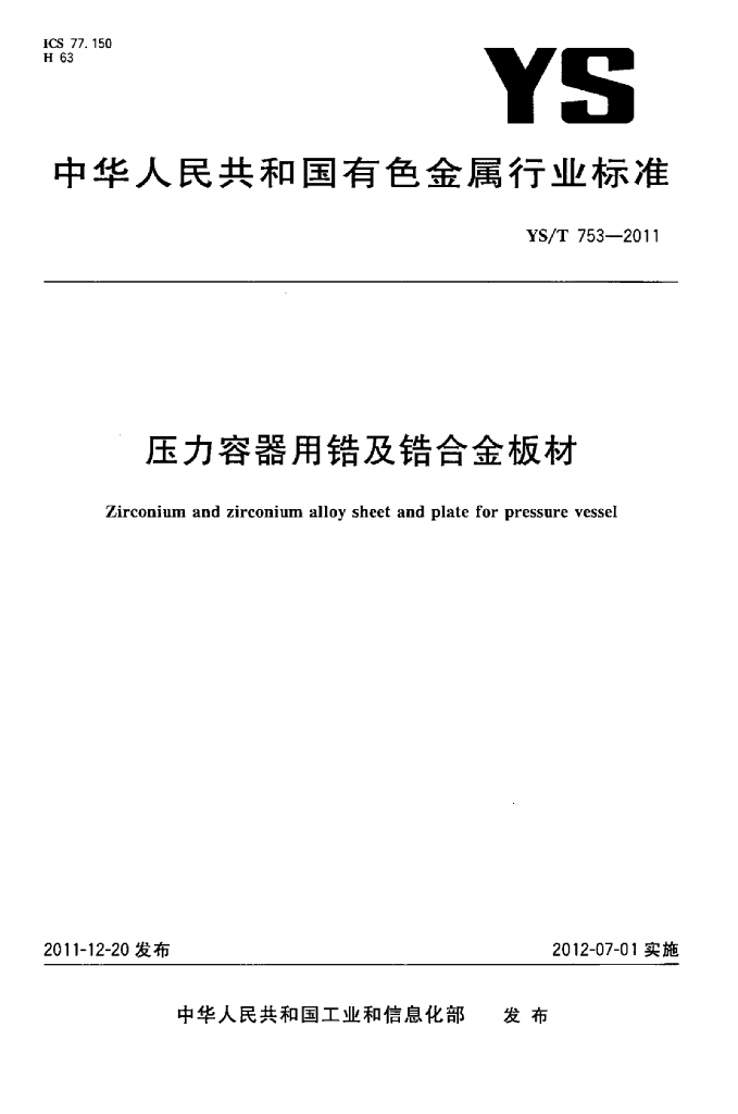 YS/T 753-2011 压力容器用锆及锆合金板材