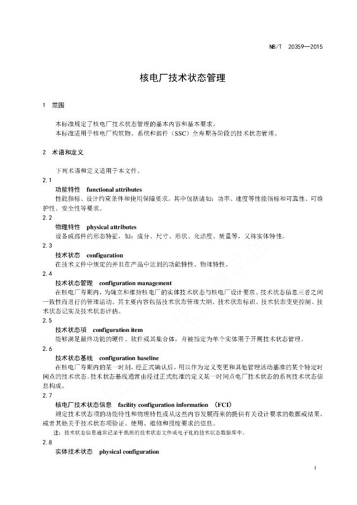NB/T 20359-2015 核电厂技术状态管理