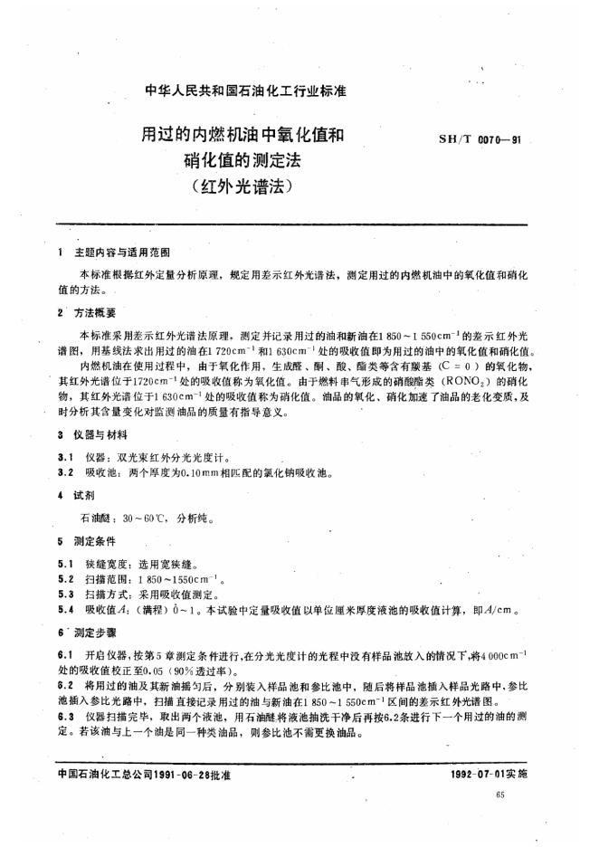 SH/T 0070-1991 用过的内燃机油中氧化值和硝化值的测定法红外光谱法