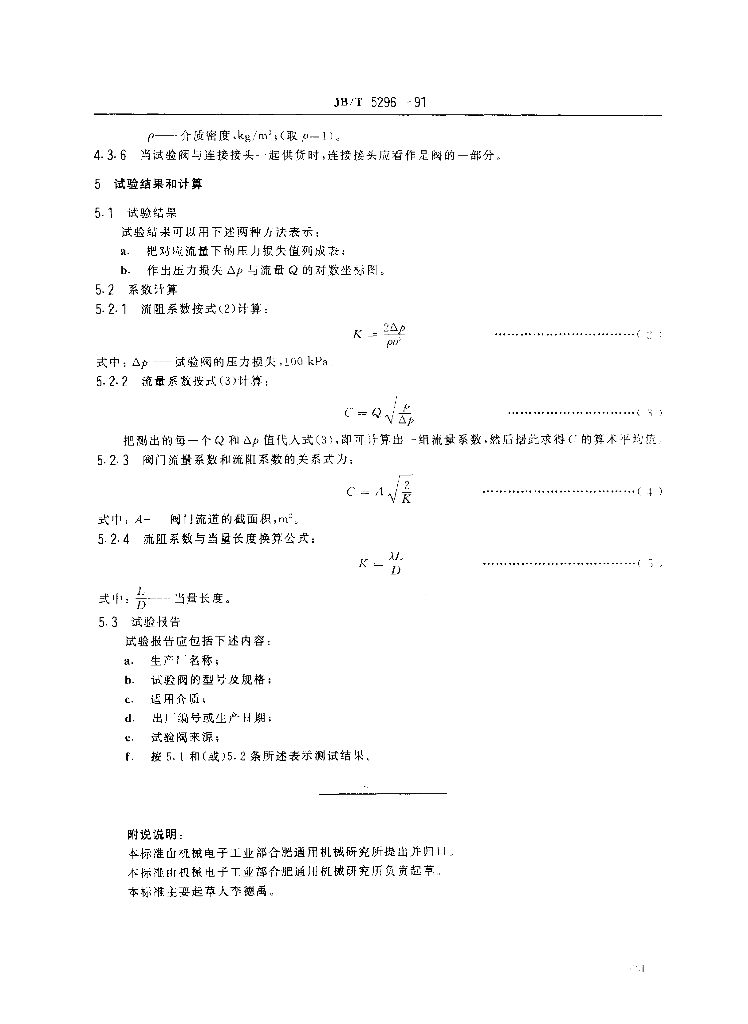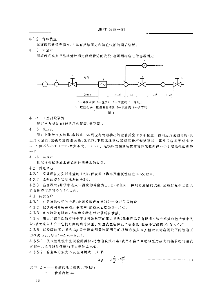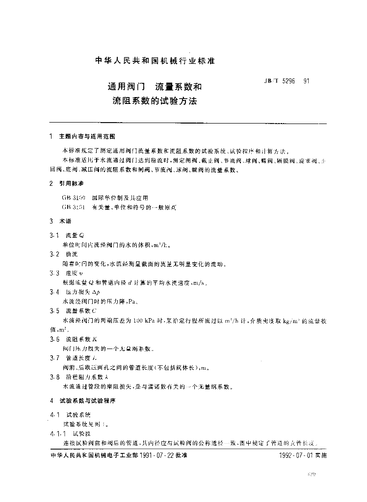 JB/T 5296-1991 通用阀门 流量系数和流阻系数的试验方法