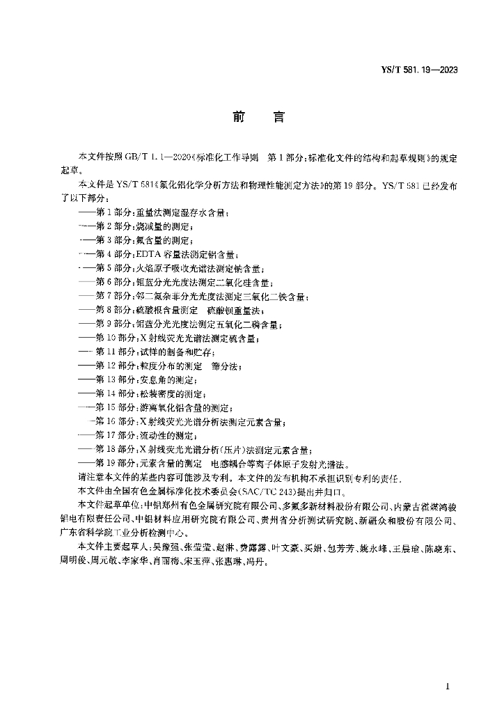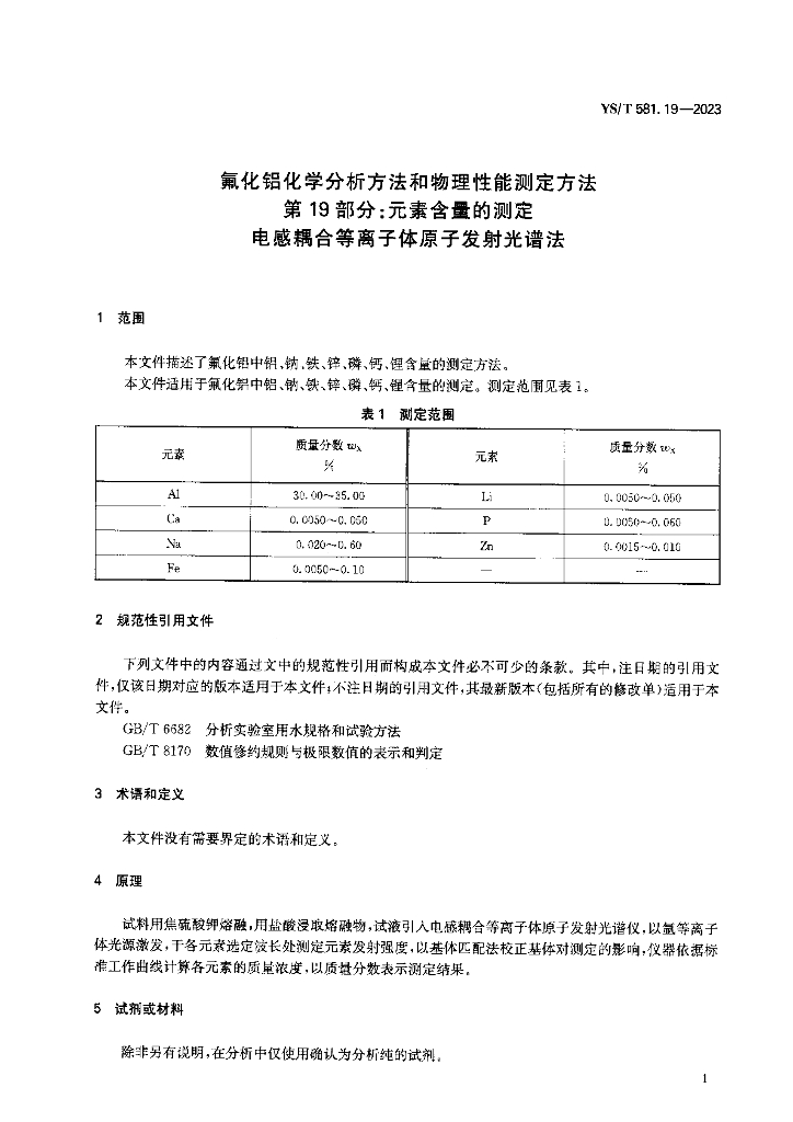 YS/T 581.19-2023 氟化铝化学分析方法和物理性能测定方法 第19部分:元素含量的测定 电感耦合等离子体原子发射光谱法
