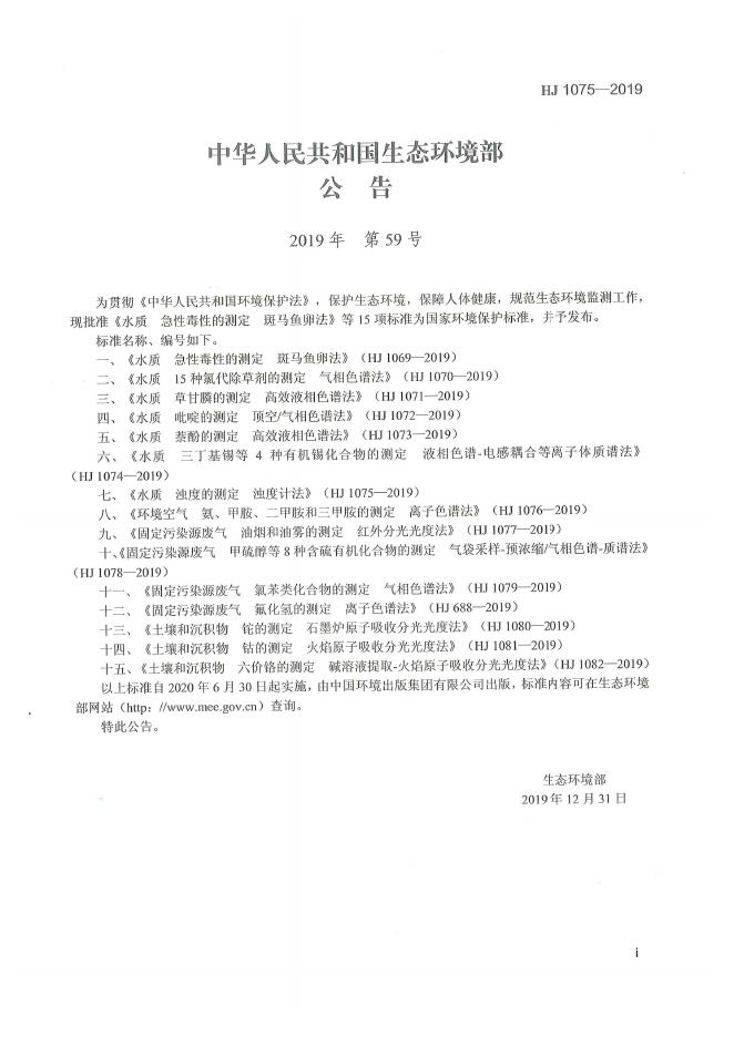 HJ 1075-2019 水质 浊度的测定 浊度计法