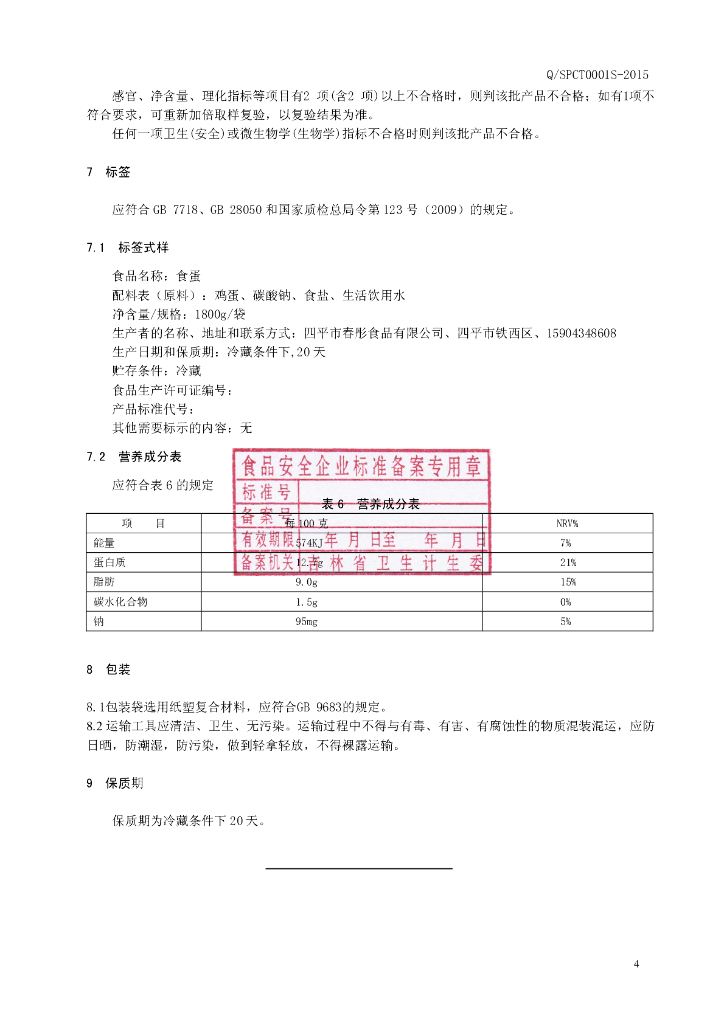 Q/SPCT 0001S-2015 四平市春彤食品有限公司 食蛋