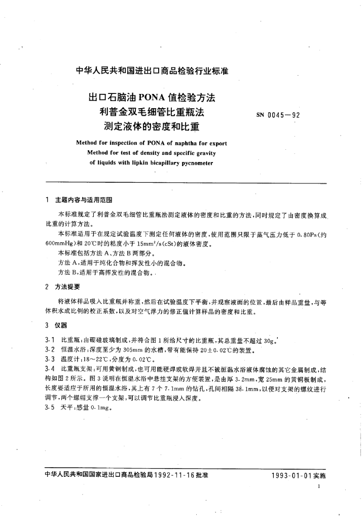 SN 0045-1992 出口石脑油PONA值检验方法利普金双毛细管比重瓶法测定液体的密度和比重