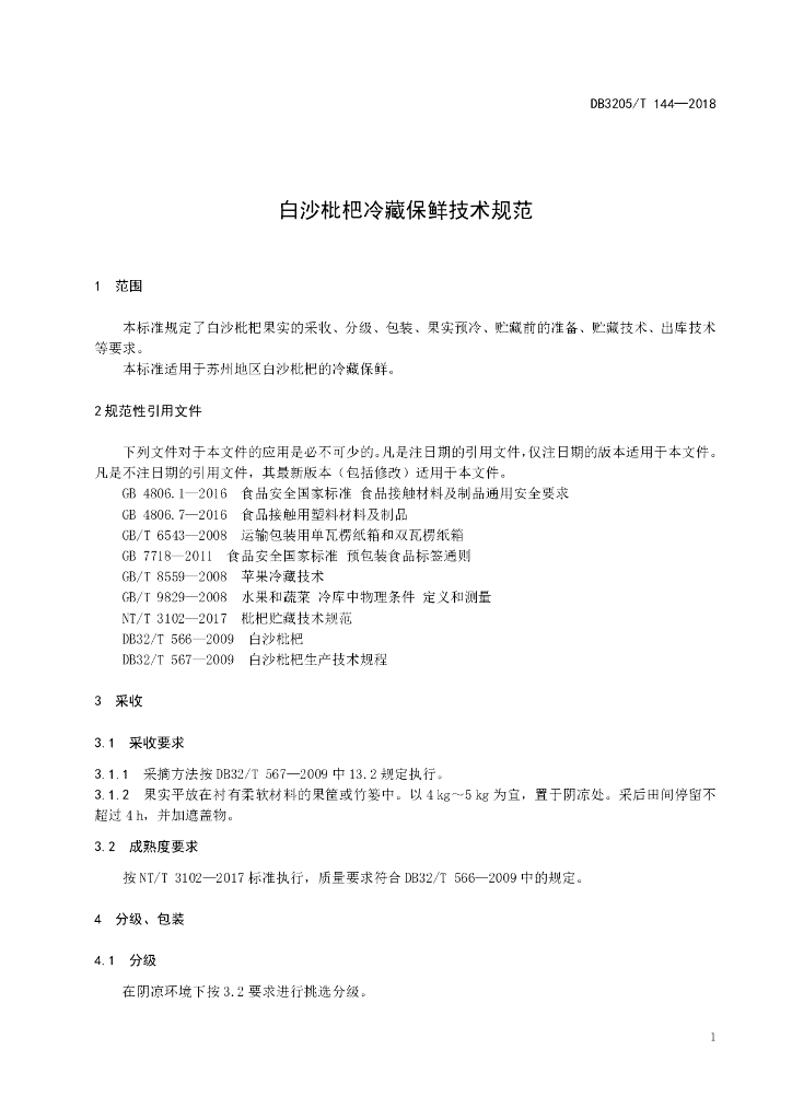 DB3205/T 144-2018 白沙枇杷冷藏保鲜技术规范