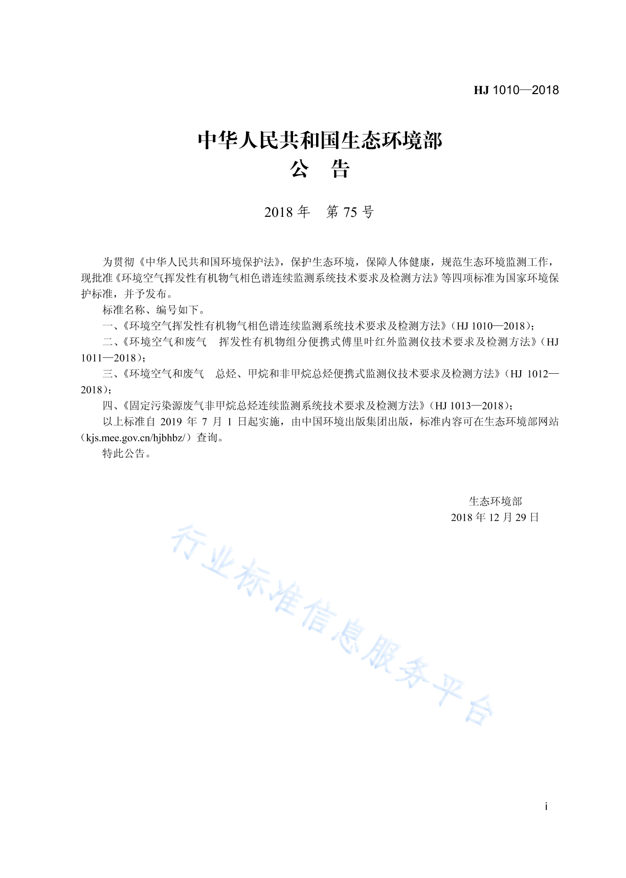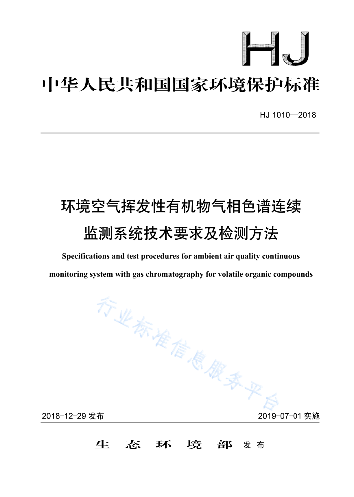 HJ 1010-2018 环境空气挥发性有机物气相色谱连续监测系统技术要求及检测方法