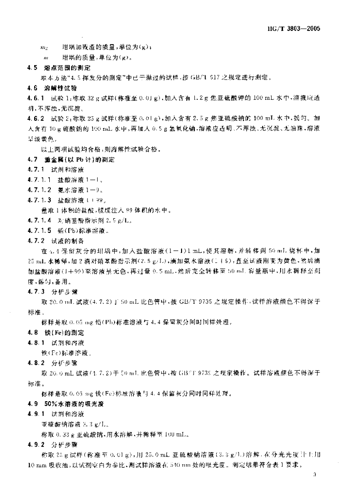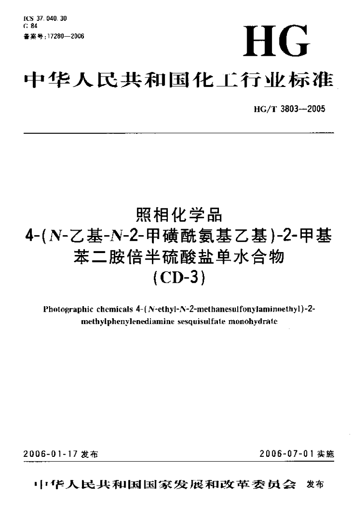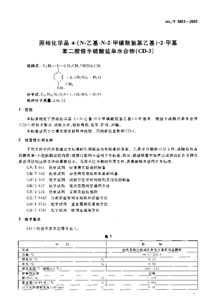 HG/T 3803-2005 照相化学品 4-(N-乙基-N-2-甲磺酰氨基乙基)-2-甲基苯二胺倍半硫酸盐单水合物(CD-3)