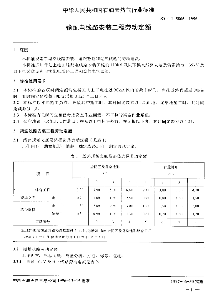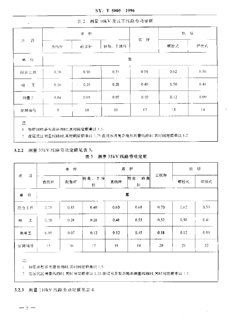 SY/T 5805-1996 输配电线路安装工程劳动定额