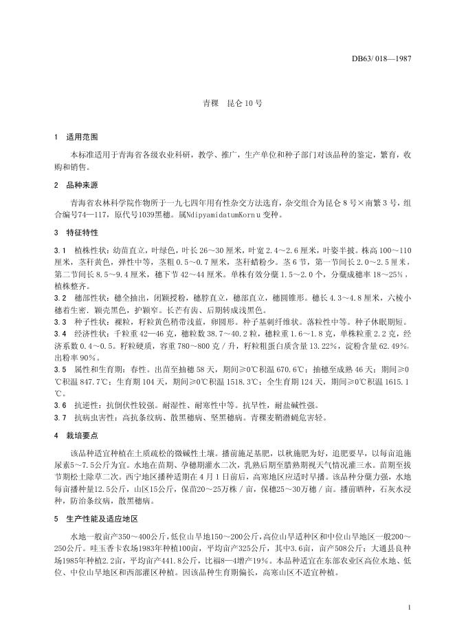 DB63/T 018-1987(2020) 青稞 昆仑10号