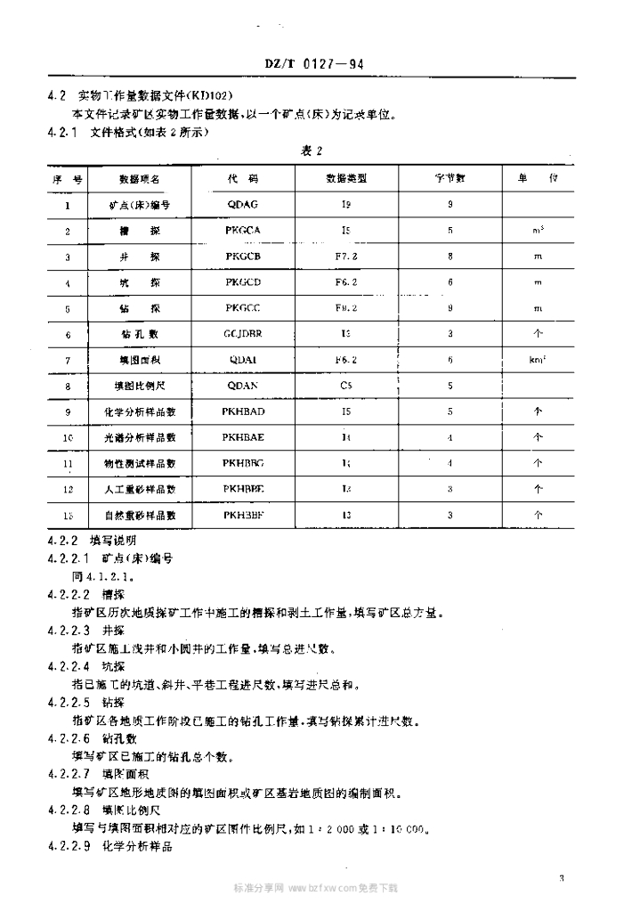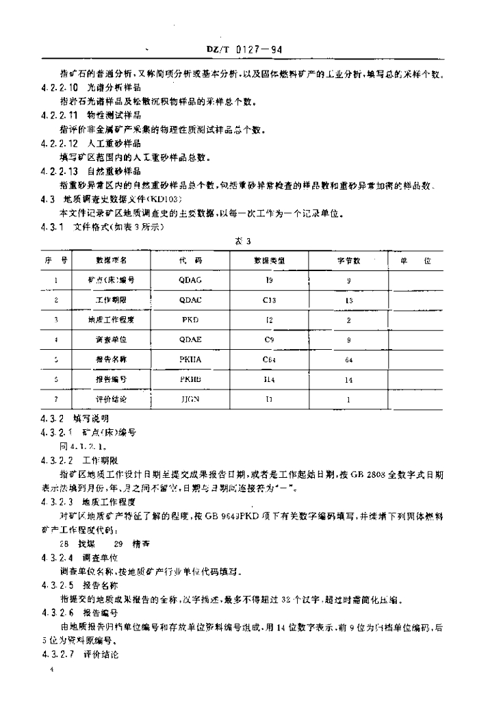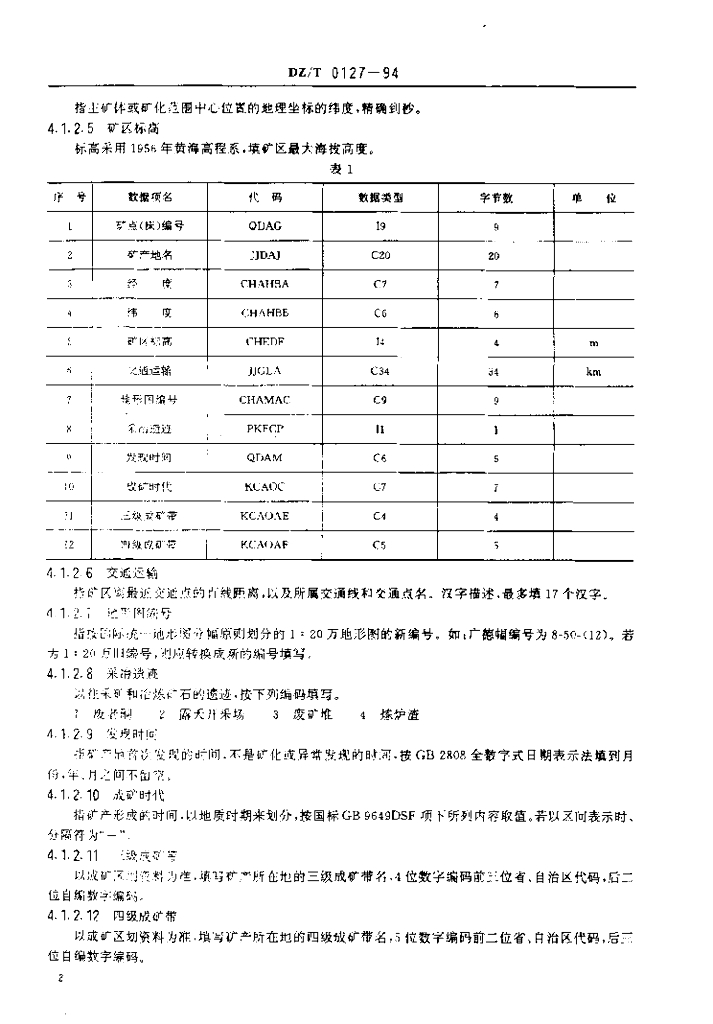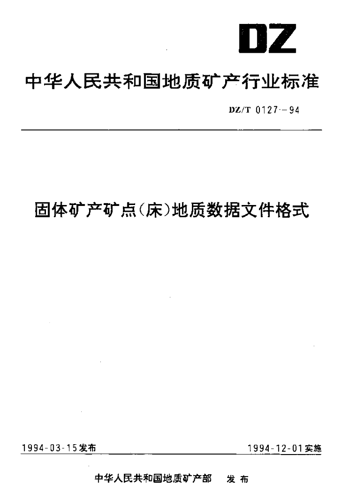 DZ/T 0127-1994 固体矿产矿点(床)地质数据文件格式