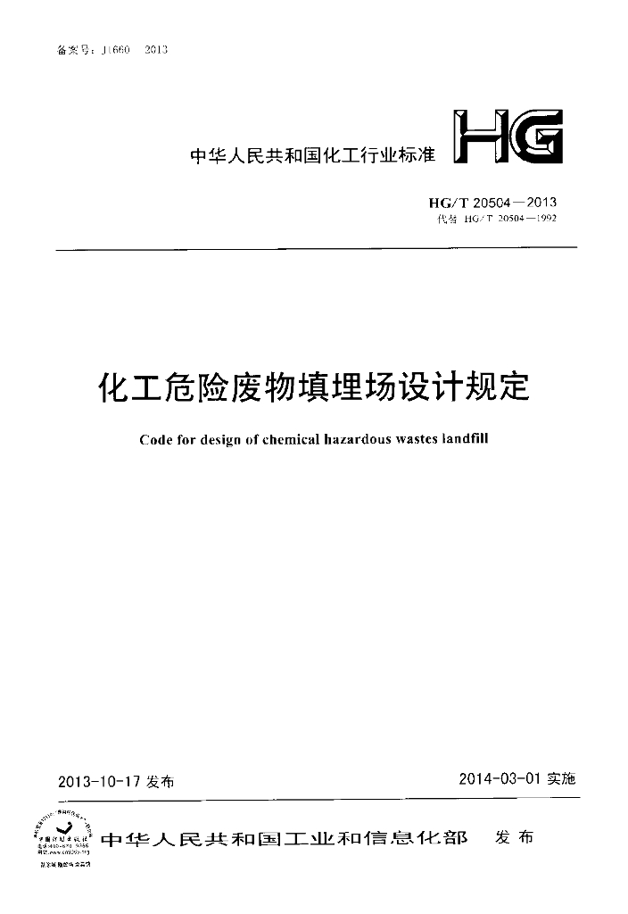 HG/T 20504-2013 化工危险废物填埋场设计规定
