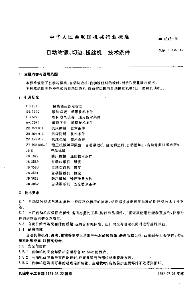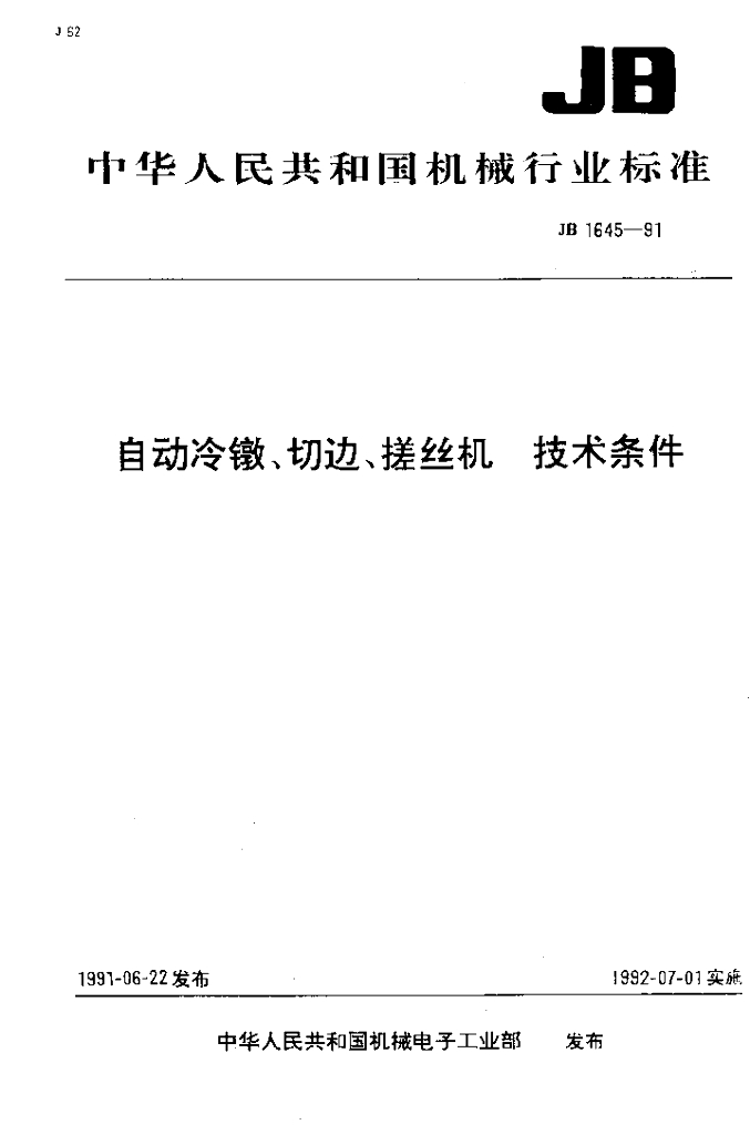 JB 1645-1991 自动冷激、切边、搓丝机技术条件