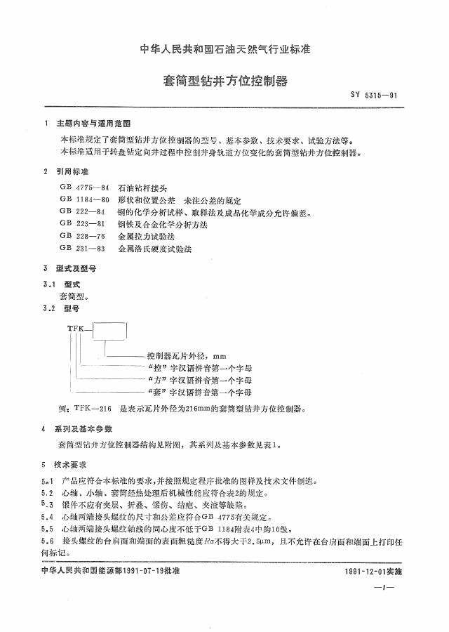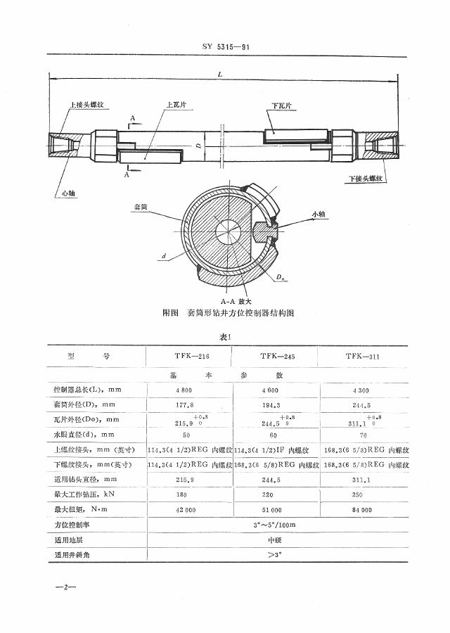 SY 5315-1991 套筒型钻井方位控制器