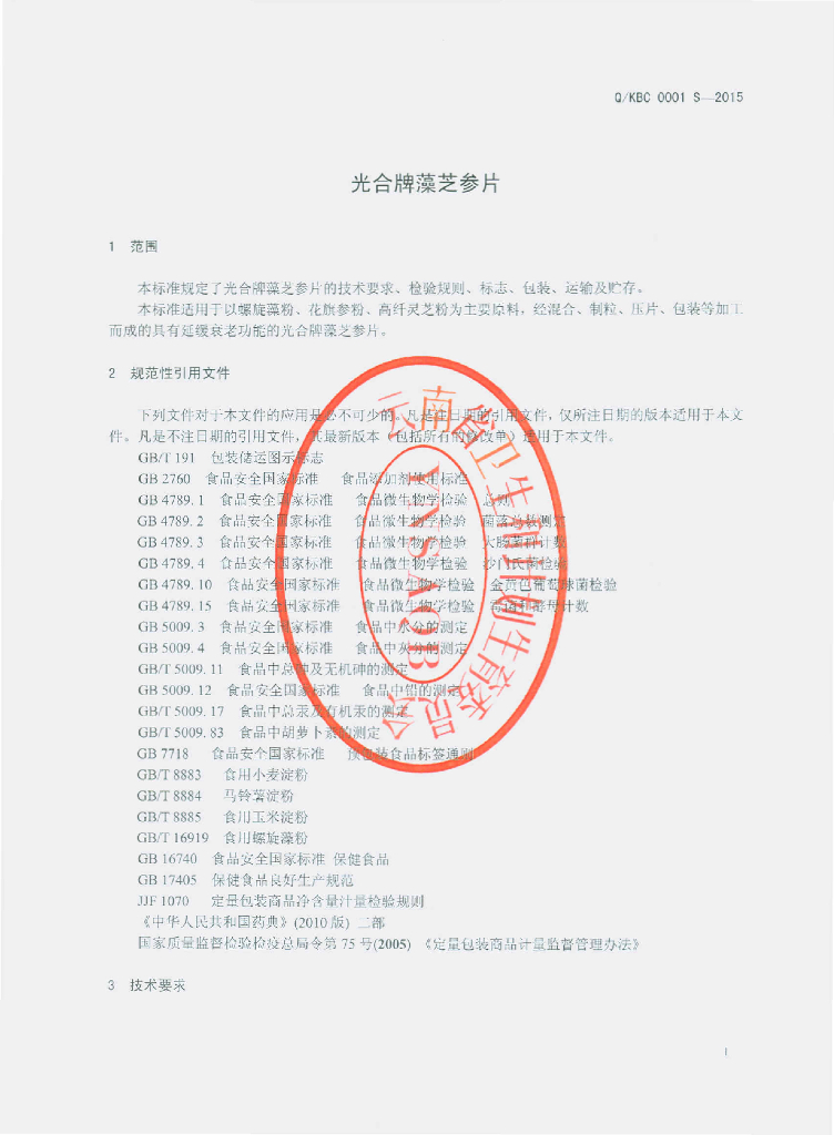 Q/KBC 0001S-2015 昆明市本草食品有限公司 光合牌藻芝参片