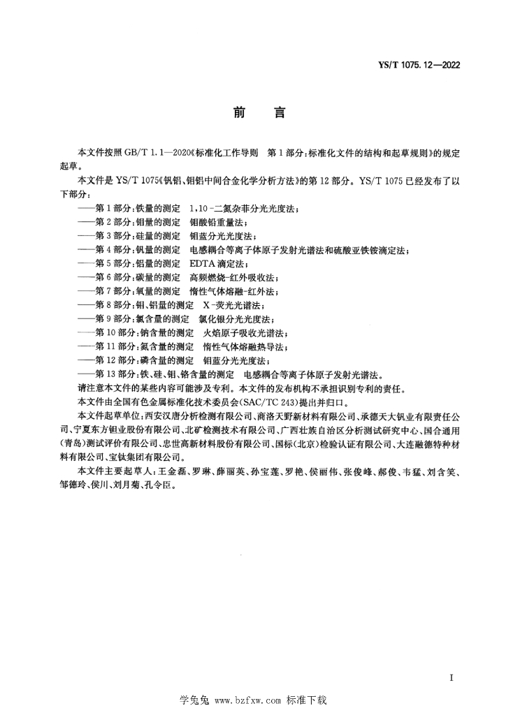 西安汉唐分析检测有限公司、商洛天野新材料有限公司、承德天大钒业有限责任公司、宁夏东方钽业股份有限公司、北矿检测技术有限公司、广西壮族自治区分析测试研究中心、国合通用(青岛)测试评价有限公司、忠世高新材料股份有限公司、国标(北京)检验认证有限公司、大连融德特种材料有限公司、宝钛集团有限公司