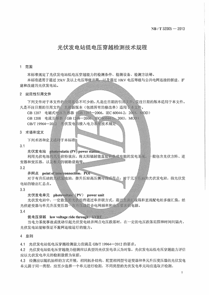 NB/T 32005-2013 光伏发电站低电压穿越检测技术规程