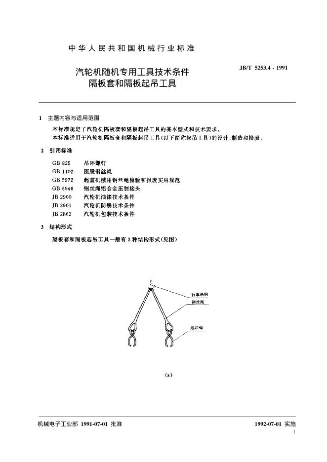 JB/T 5253.4-1991 汽轮机随机专用工具技术条件 隔板套和隔板起吊工具