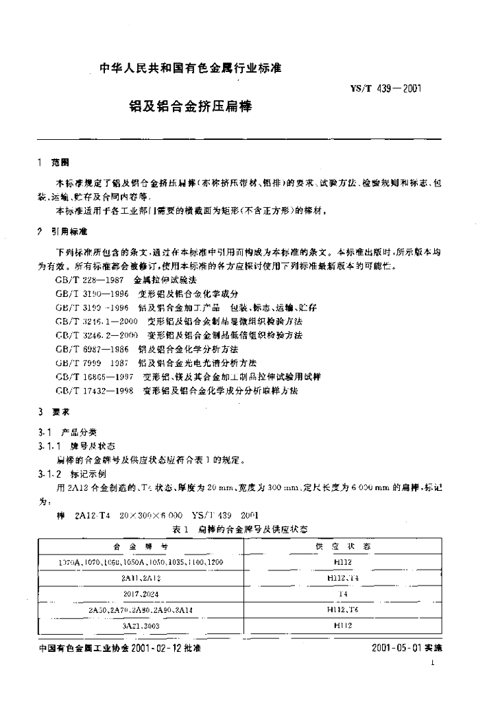 YS/T 439-2001 铝及铝合金挤压扁棒