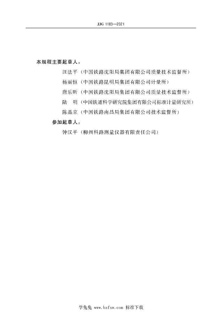 汪法平(中国铁路沈阳局集团有限公司质量技术监督所)、杨丽恒(中国铁路昆明局集团有限公司计量所)、唐乐昕(中国铁路沈阳局集团有限公司质量技术监督所)、陆明(中国铁道科学研究院集团有限公司标准计量研究所)、陈晶京(中国铁路南昌局集团有限公司技术监督所)、钟汉平(柳州科路测量仪器有限责任公司)
