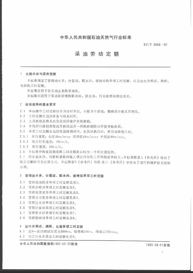 SY/T 5556-1992 采油劳动定额