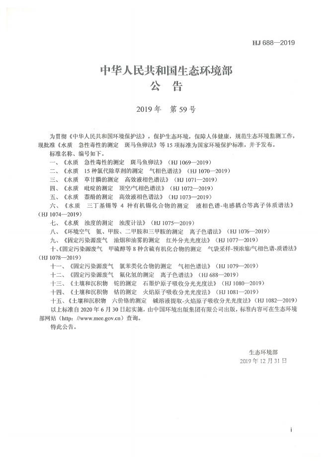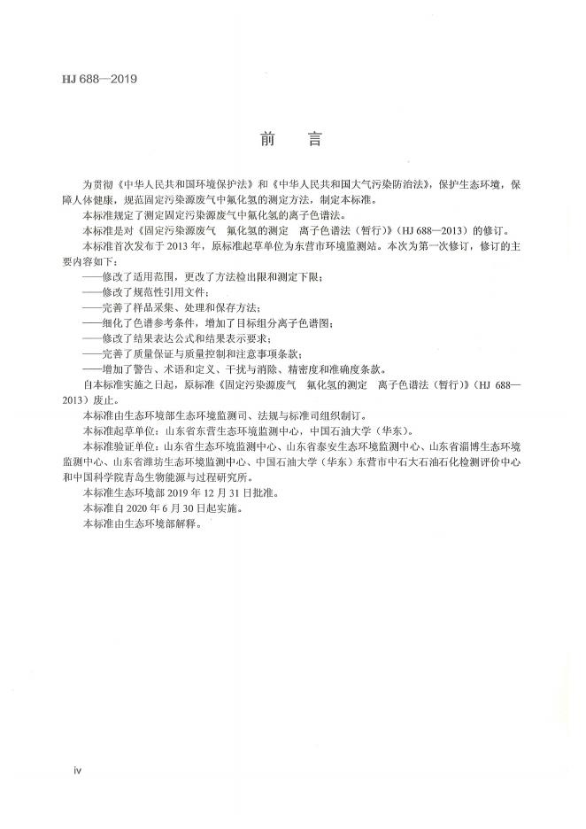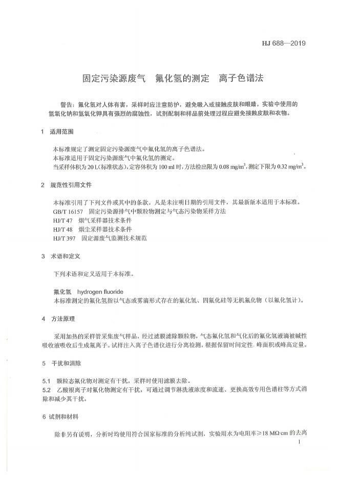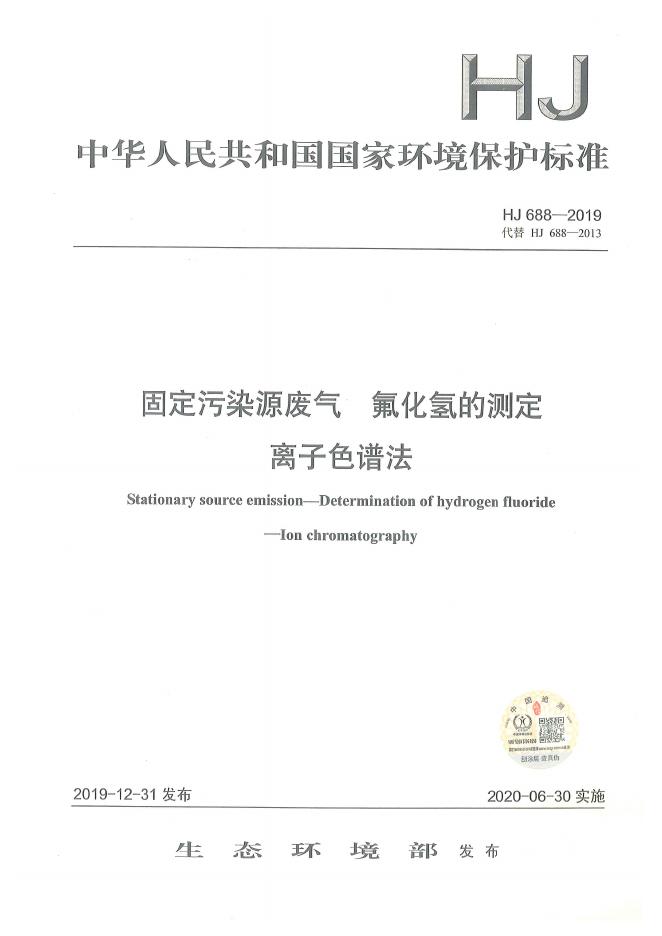HJ 688-2019 固定污染源废气 氟化氢的测定 离子色谱法