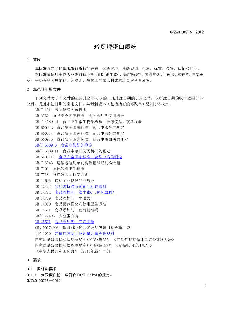 Q/ZAO 0071S-2012 珍奥牌蛋白质粉