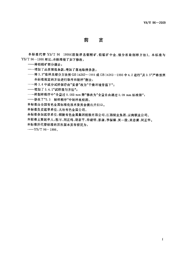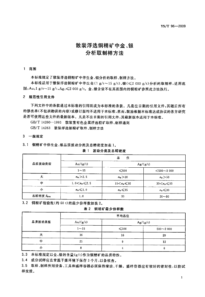 YS/T 96-2009 散装浮选铜精矿中金、银分析取制样方法