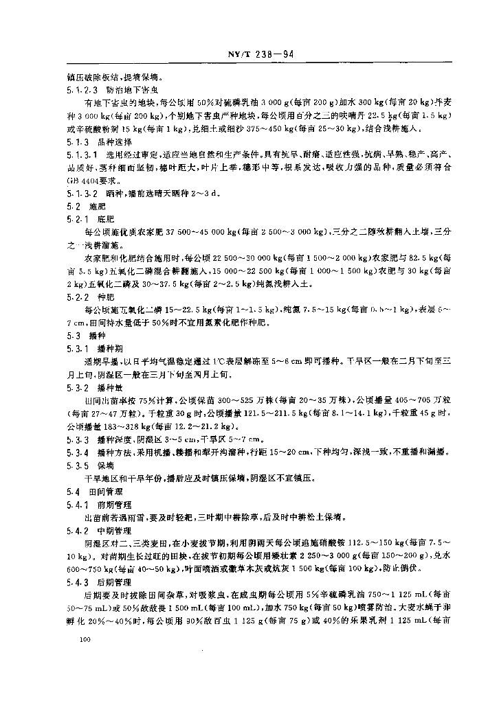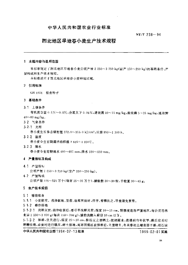 NY/T 238-1994 西北地区旱地春小麦生产技术规程