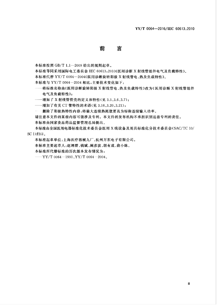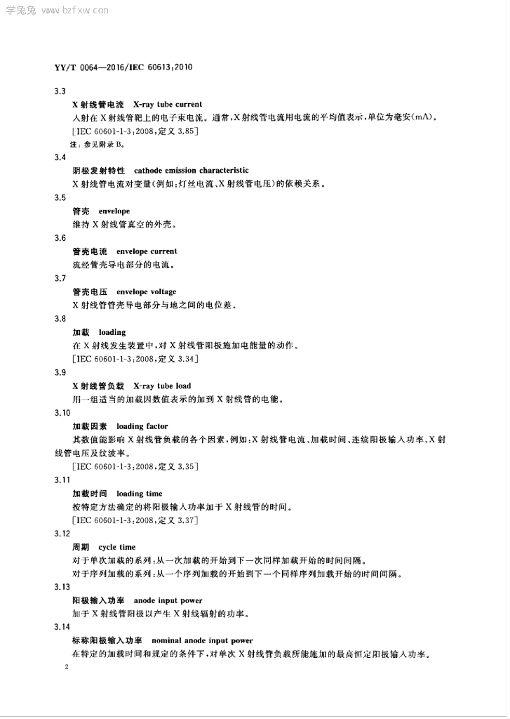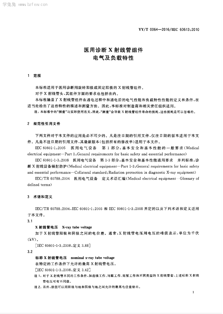 YY/T 0064-20 16/IEC 60613:2010 医用诊断X射线管组件电气及负载特性