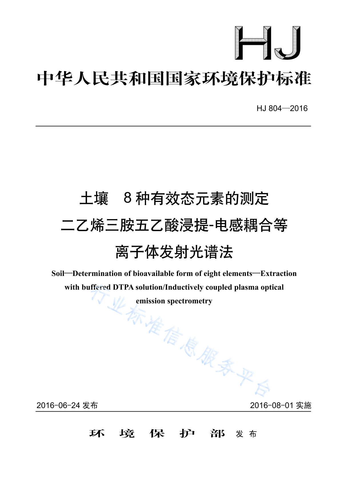 HJ 804-2016 土壤 8种有效态元素的测定 二乙烯三胺五乙酸浸提-电感耦合等离子体发射光谱法