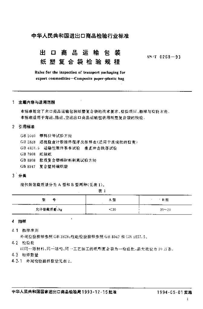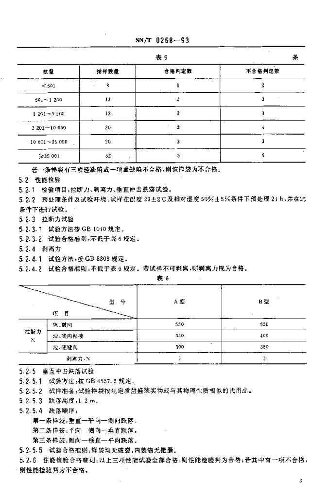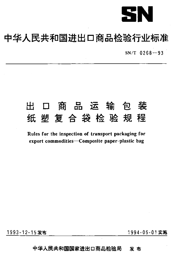 SN/T 0268-1993 出口商品运输包装 纸塑复合袋检验规程